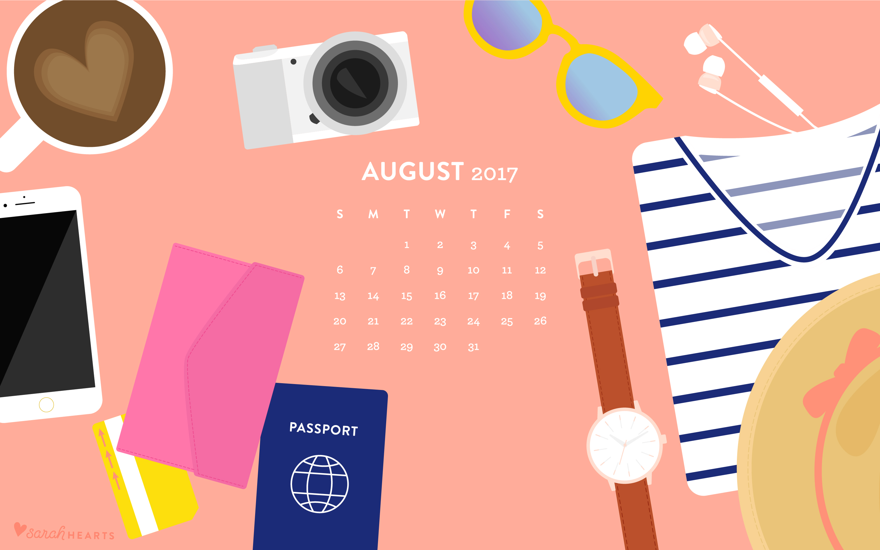 It seems like everyone is travel this month (myself included) so I thought it would be appropriate to create a travel inspired wallpaper. This month’s design features an illustration of a flat lay of popular travel items, including many of my go-to items like an RFID blocking travel (complete with a sim card holder) and a classic striped shirt.